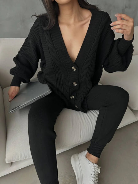 Women Knitted Two Piece Set V-Neck Cardigan Sweater Slim Fit Long Pants Autumn Winter Elegant Buttons Solid Clothes